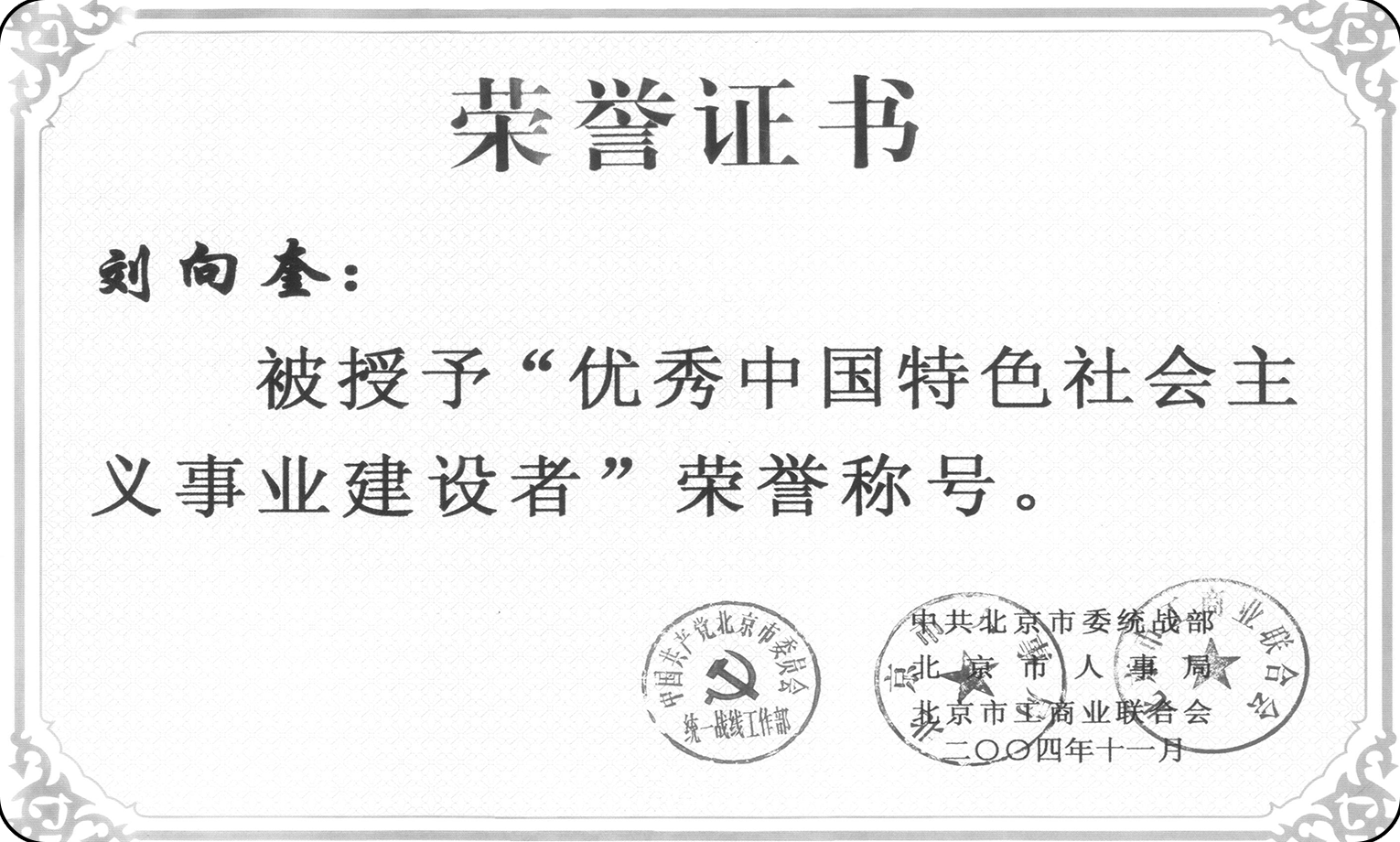 2004年11月,劉向奎總經理被北京市委統戰部、人事局、工商業聯合會評為“優秀中國特色社會主義事業建設者”。